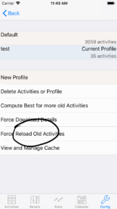 • Go to Config, Profile and select “Delete Some Activities”. This will delete all the activities from the app up to the one you have selected. It will not delete anything on any server, only in the app local files.
