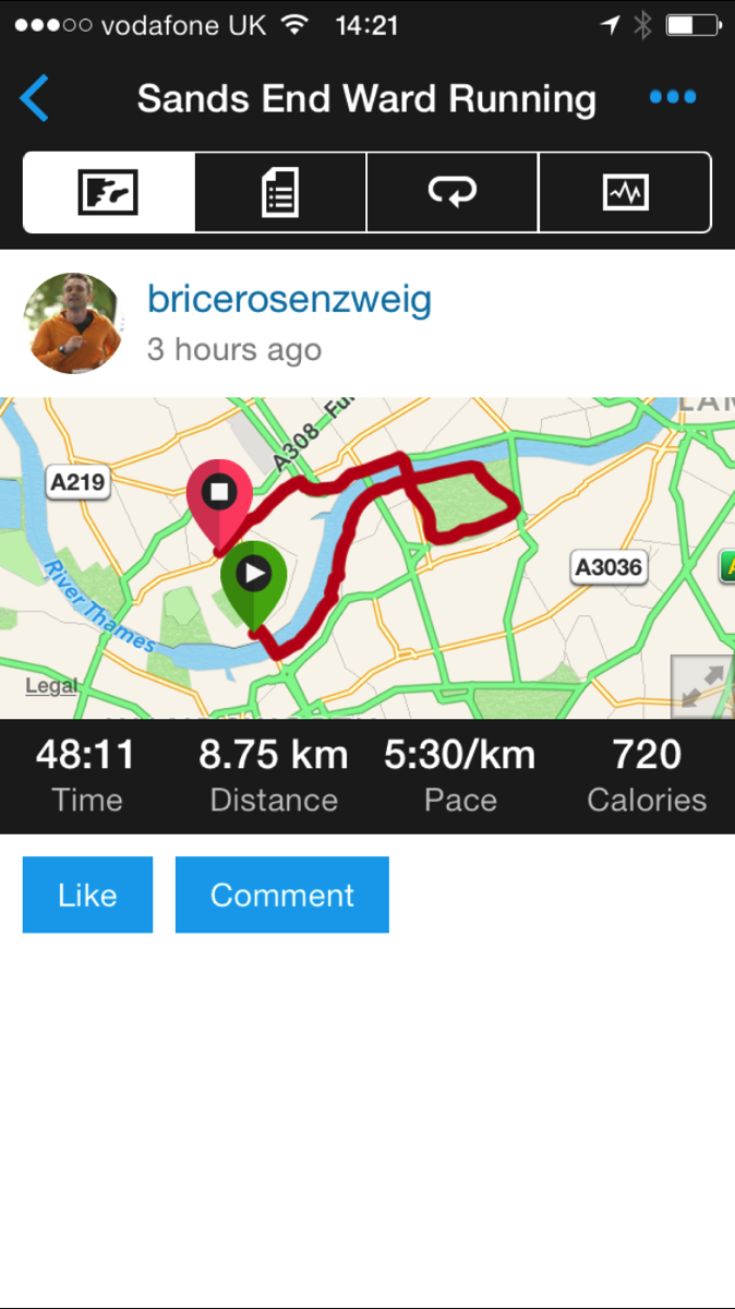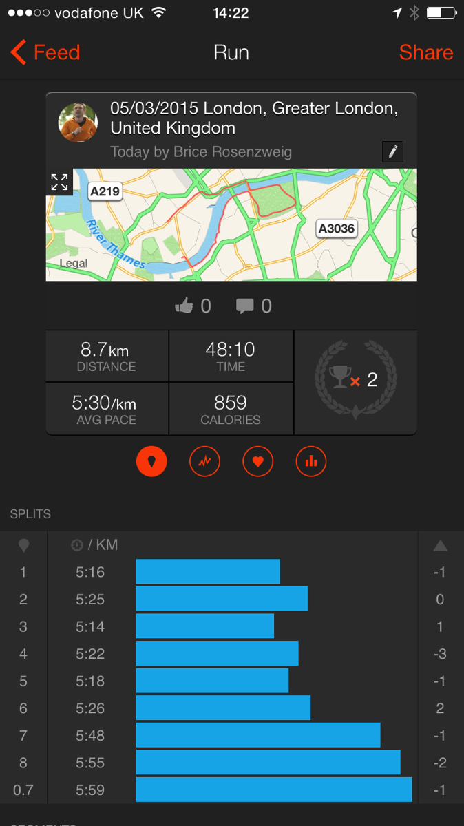 The feed is neatly shows your and your friend’s activities. It’s extremely easy to add a quick thumb up or comment. And it also let you look in detail at your friends activity and of course compare yourself to them on given segment. Also automatically detects when you ran with a friend.