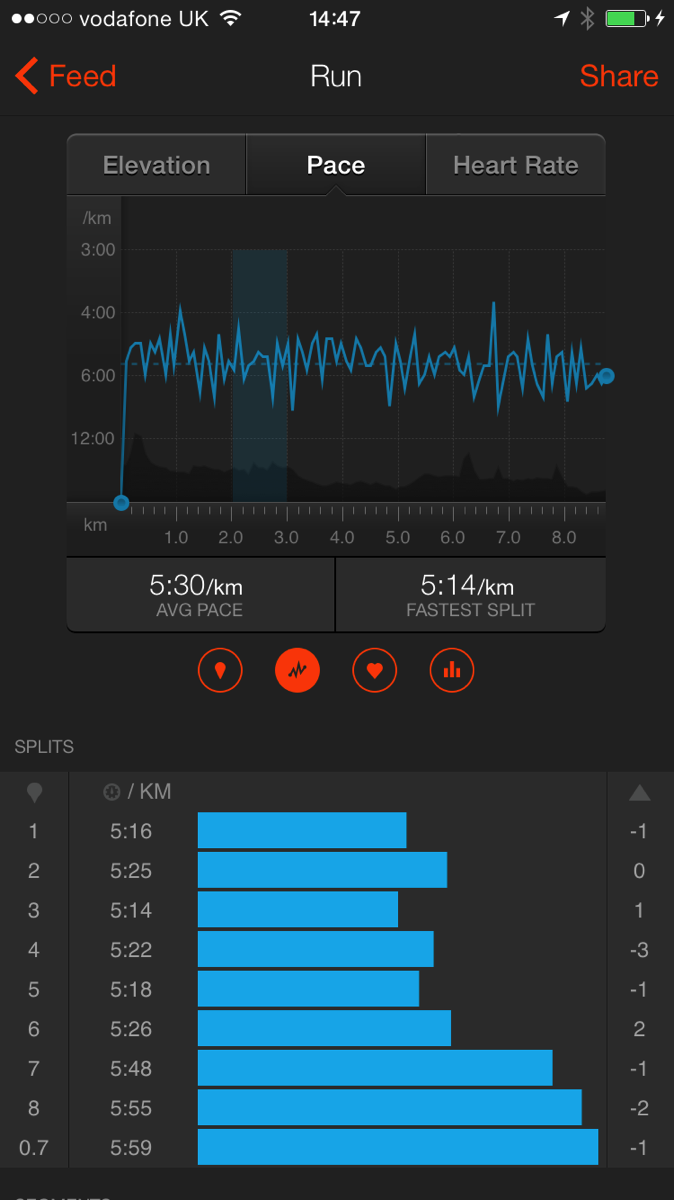 This is something that always bothered me with most apps and services. The plots of pace especially, but sometimes heart rate as well seem to be scaled and smoothed so poorly that they didn’t allow you to see really what happened. This was one of the key initial motivation for writing ConnectStats (along with more information on the map). I spend a lot of time working on the scaling, filtering and smoothing of the graphs in connectstats so that it gives you a good picture of what happened at a glance. Recently I also added overlay of the laps average which I feel is quite helpful.