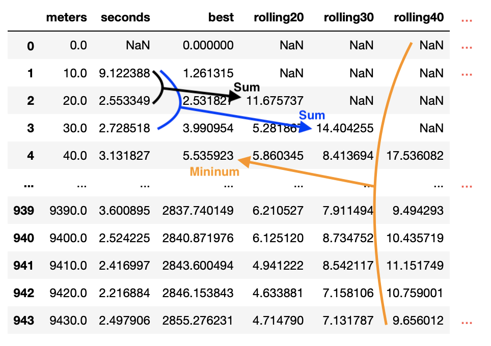 The core of the logic is to compute all the rolling sum or average of the values for each point in the activities. Then for each rolling sum or average it will take the minimum or the maximum to find the best value. You can see it illustrated below in the case of speed with the latest algorithm. The app will have to calculate rolling20 … rolling 9430, a 943 x 943 diagonal matrix for an activity of 9430 meters or almost 10 kilometres…