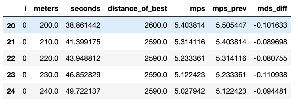 Let’s focus on one such issue. In one of my activities, the method found that my best time in that activity for 200 meters was 38.86 seconds or 5.4 meter/seconds, which correspond at a 3:04 min/kilometer, which is very unrealistic for me.