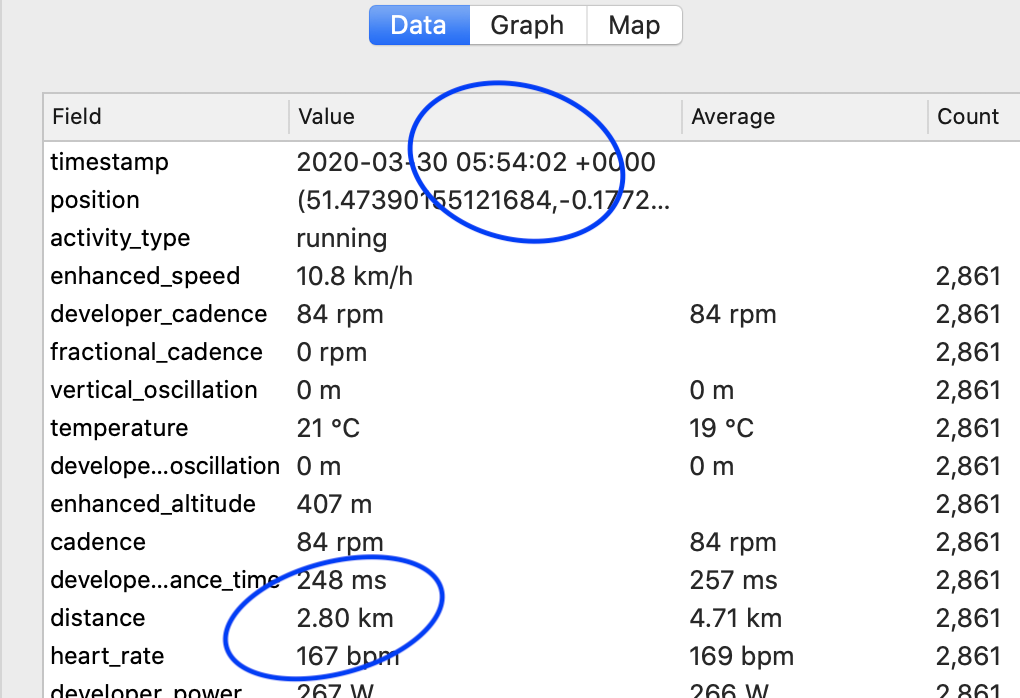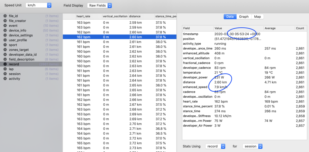 As you can see above, while I compute the best time for a distance, I keep track of the point in the overall activity at which this timing happened. Here the distance of the best point was reached at the 2600 meters in the activity. So let’s go back to the original fit file, using FitFileExplorer a utility I wrote, available on the Mac App Store and included in the ConnectStats open source repo, to help me see what’s going on…