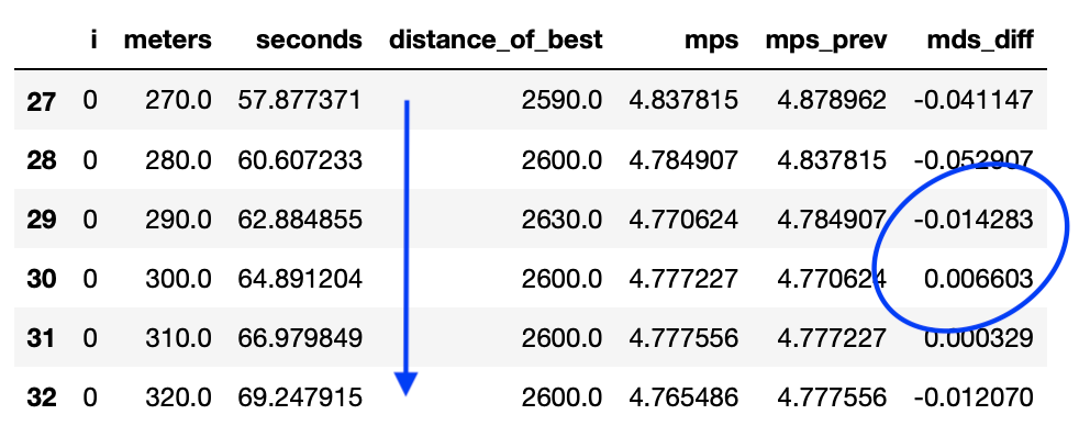 Of course, beside the good reason above, I also found some silly bugs in the accounting of all the indices while doing the interpolations of the re-sampling. This was mostly an issue for the very short interval, as I was allocating the speed to the wrong distance. If you make an error of one index it can make a difference for the short distances. Looking at a specific example say the best time reported in the GPS file after 300 meters was 64.89 seconds. Is that 64.89 over the 300 meters or over the distance up to the next point in the gps file (310 meters)? That result of a difference of speed of 3:29 min/km instead of 3:36 min/km. Definitely noticeable…