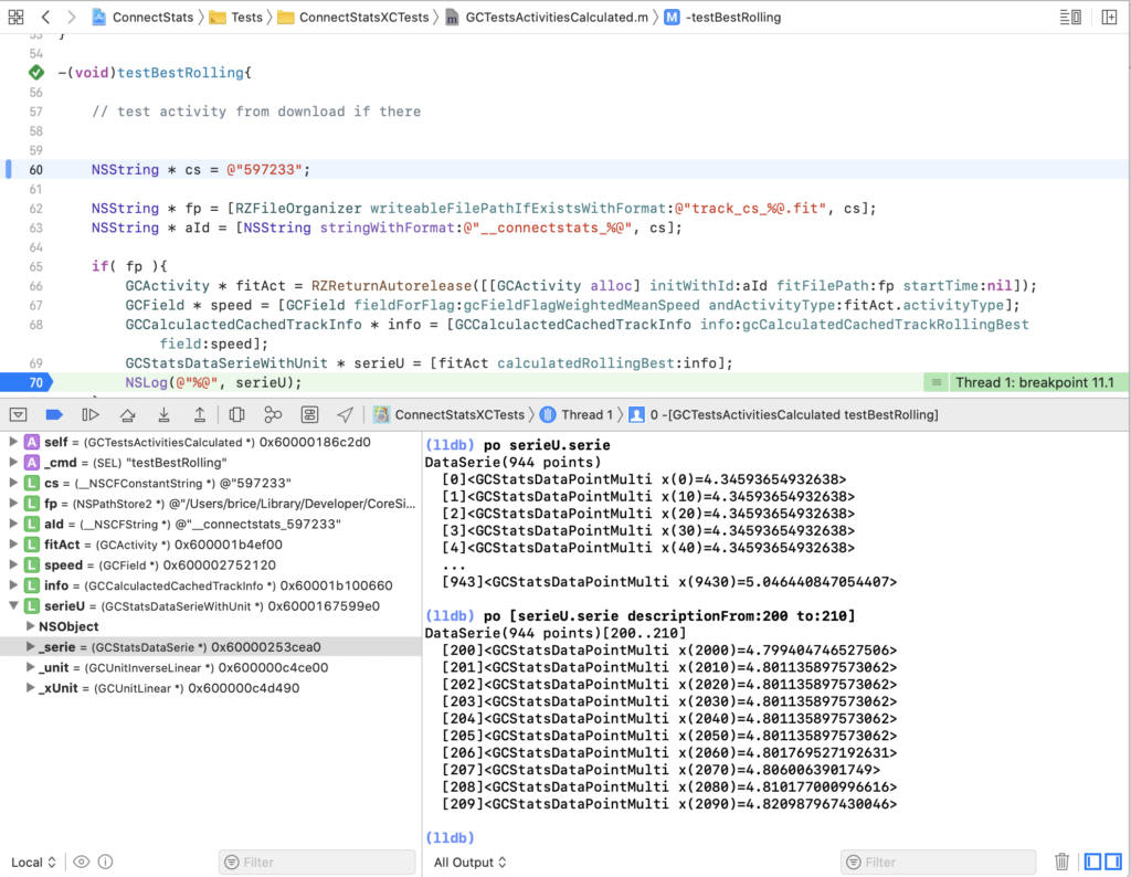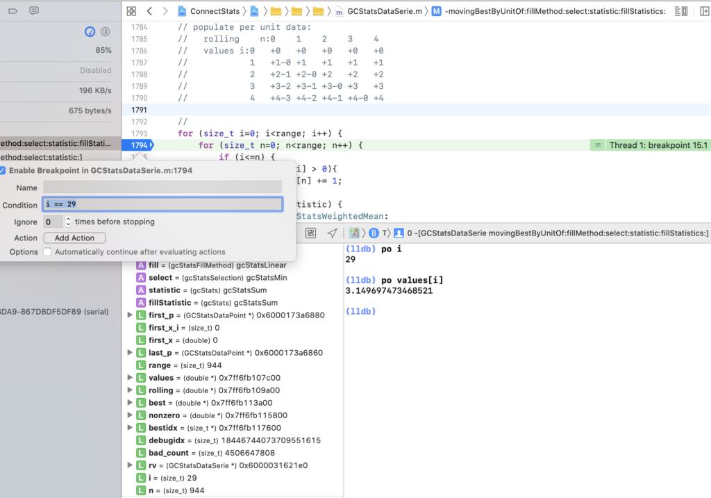 Trying to understand what was wrong in my Best Rolling Curve Calculation pushed my ability to use Xcode debugger to its limit. The quirks I was trying to understand were happening on large time series after multiple level of sampling, rolling averages, etc on noisy data.